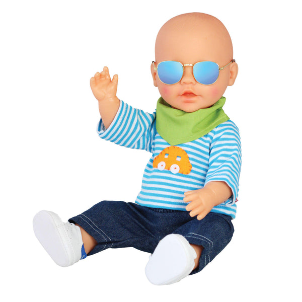 Maak van je pop een stoere jongen met deze poppenoutfit. Het gestreepte shirt heeft een oranje auto op de voorzijde en past perfect op de donkerblauwe jeans. Het groene sjaaltje maakt de stoere look compleet. Dankzij het klittenband aan de achterzijde van het shirt is de outfit gemakkelijk aan en uit te trekken. De outfit is geschikt voor poppen van 35 tot 45 cm groot.