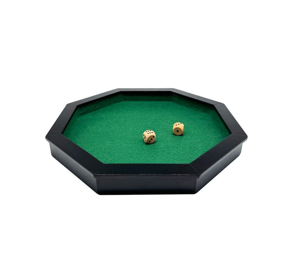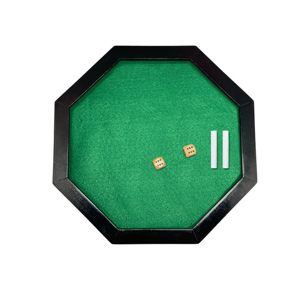 8-kantige pitjesbak 28 cm van hout met ingelegd groen vilt, inclusief krijtjes en 2 dobbestenen. Score kan met krijt op de zijkanten van de bak genoteerd worden.
