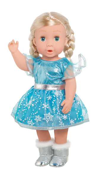 Maak van je pop een echte ijsprinses met deze poppenjurk. De jurk heeft een glinsterende bovenzijde en een wijdstaande rok met ijssterren erop. Dankzij de klittenband aan de achterzijde is het jurkje eenvoudig aan en uit te trekken. De ijsprinses jurk is geschikt voor poppen van 35 tot 45 cm groot.