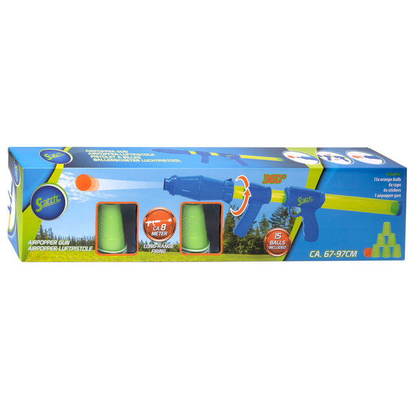 Dit groen/blauwe luchtpistool knalt de oranje ballen tot wel 8 meter ver. Er kunnen meerdere ballen achter elkaar geschoten worden. De loop van het luchtpistool is 360° draaibaar. In de set zitten 15 oranje softballen, 6 bekers en 6 stickers. Het luchtpistool is 67,5 centimeter lang.