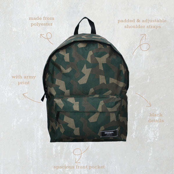 Deze stoere jongens rugzak van Skooter uit de collectie Be Great beschikt over een all-over print in de kleur army en bevat twee vakken. Zowel het grote vak als het voor vak zijn beide te openen en te sluiten door middel van een handige ritssluiting. Aan de bovenkant van de tas bevindt zich een lus, zo kun je de tas ook hiermee gemakkelijk optillen. De schouderbanden zijn verstelbaar, de tas is dus voor iedereen bruikbaar. De rugzak is afgewerkt met zwarte details en een stoere zwarte badge.
