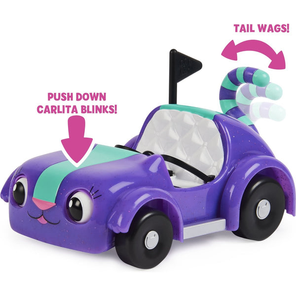Start de motor en ga op een kattastisch picknickavontuur met Gabby's Poppenhuis Carlita & Pandy Poek Picnic-set. Carlita lijkt precies op de speelse half-kat en half-auto die je uit de tv-serie kent. Je kunt Pandy Poek en een ander Gabby's Poppenhuis-personage uit je collectie in haar stoelen plaatsen (extra speelgoedfiguren afzonderlijk verkocht). Carlita komt tot leven en zwaait met haar staart van links naar rechts als je haar voortduwt. Druk op haar kap om haar te laten knipperen of duw naar beneden op de linker- en rechterkant om haar naar links en rechts te laten kijken.