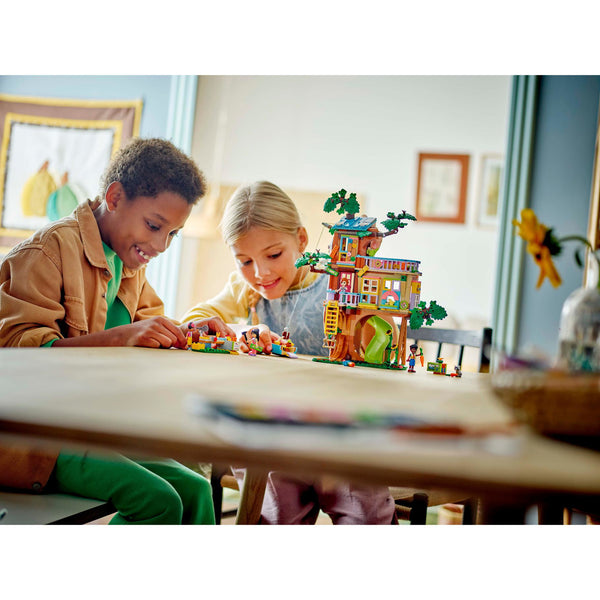 Laat de fantasie groeien met dit LEGO Friends Boomhut voor de vrienden (42652) bouwpakket voor kinderen. Met deze set kunnen meisjes en jongens vanaf 8 jaar hun eigen vriendschapsavonturen rollenspellen spelen. De set bevat 4 LEGO Friends poppetjes, een speelgoed dieren figuur van een hond en een wasbeer, plus een bouwbare werkbank met gereedschap. Deze set zit vol leuke verhalen waarin de personages Liann, Autumn, Leo en Zac samen tijd doorbrengen in de boomhut die ze hebben gebouwd. Er zijn ruimtes om te spelen, te koken en te slapen, plus een groenteperceel met wortels om te plukken. Andere leuke details zijn de lift voor Gurkie de hond en de geheime schuilplaats van de wasbeer. Stimuleer de creativiteit en laat kinderen de speciale tegels gebruiken om de boomhut te versieren. De ramen zijn verwisselbaar, zodat jonge bouwers hun model nog verder kunnen aanpassen. Bekijk ook het andere speelgoed voor sociale ontwikkeling in het LEGO Friends universum, waar nog veel meer verhalen te ontdekken zijn (sets apart verkrijgbaar). Dit LEGO dieren speelgoed voor kinderen is een fantastisch cadeau voor meisjes en jongens die dol zijn op rollenspellen en bouwen. Afmetingen: het boomhutmodel in deze set is ca. 31 cm hoog, 28 cm breed en 15 cm diep. Bevat 701 onderdelen.