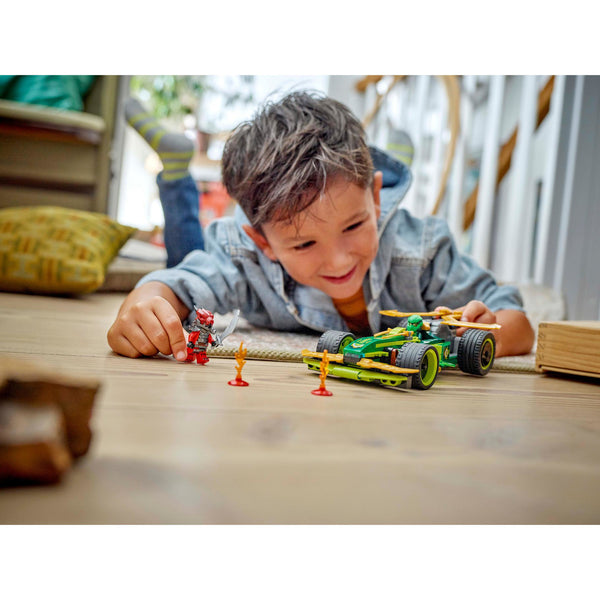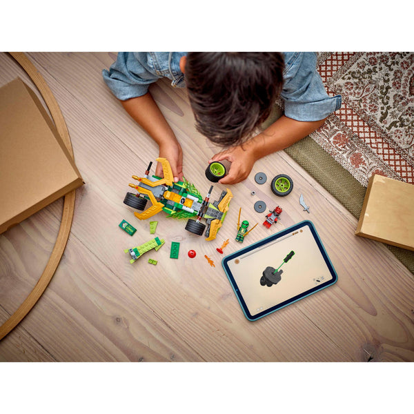 Verras je kleine ninja met de allereerste NINJAGO® pull-back racewagen! Jongens en meisjes vanaf 7 jaar kunnen supersnelle actie uit seizoen 3 van de tv-serie NINJAGO De Drakenstrijd naspelen met Lloyds pull-back racewagen (71828) door hem naar achteren te trekken, los te laten en vooruit te zien vliegen. De gestroomlijnde raceauto heeft 4 banden, een cockpit voor een minifiguur en is versierd met groene bliksemschichten. De bouwset is inclusief 2 NINJAGO minifiguren: Lloyd met 2 gouden katana's en een Draconische strijder met een zwaard waarmee kinderen spannende duels kunnen naspelen. De bouwset bevat ook 2 bliksemelementen om een kleine hindernisbaan voor de raceauto te maken. De rest van het LEGO® NINJAGO assortiment met bouwbaar ninjaspeelgoed omvat mecha, draken en tempels, zodat fans de actie kunnen naspelen met hun ninjahelden (sets apart verkrijgbaar). Elke coole ninjaspeelset kan worden gemaakt met behulp van de LEGO Builder app.