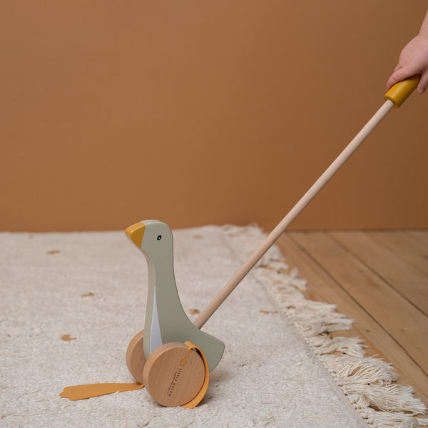 Tijdens het duwen of trekken gaan de flippers van de gans op de wielen vrolijk op en neer. Zo wordt je kindje bij de eerste stapjes vergezeld met een enthousiast maatje.