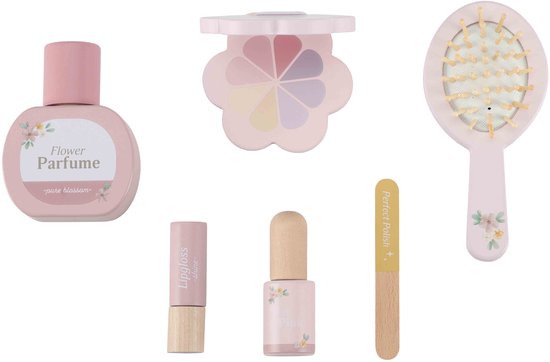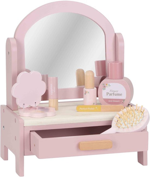 Zet je mooiste accessoires klaar en neem plaats voor de spiegel! Deze prachtige houten kaptafel heeft een draaiende spiegel en wordt geleverd met zes stijlvolle schoonheidsproducten, zoals een haarborstel, lippenstift en parfum. Perfect voor kleine beauty-liefhebbers die zich graag verkleden en tutten. Laat de fantasie maar stromen!