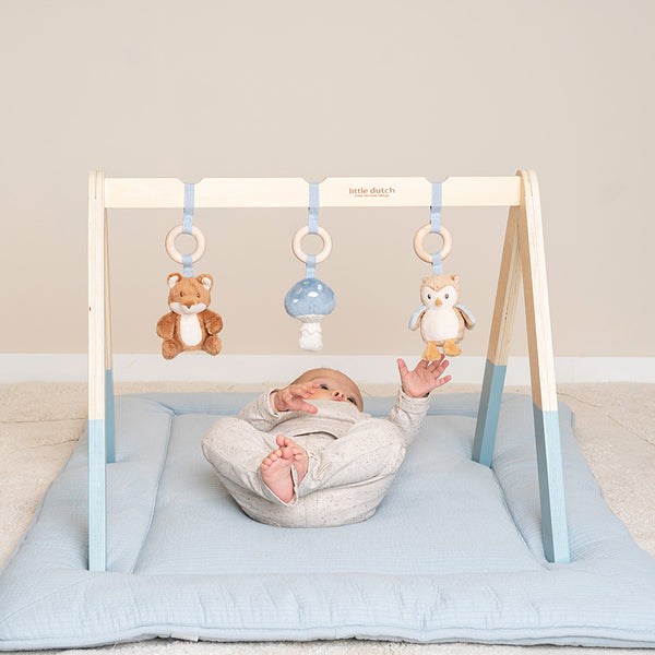 Omhoog met die kleine armpjes! Nieuwsgierige baby's vermaken zich kostelijk met deze houten babygym. Er zijn drie verschillende activiteitenspeeltjes die voor het vermaak zorgen: een lief vosje, de wijze uil en een paddenstoel. De babygym ontwikkelt de hand-oogcoördinatie, verbetert de motoriek en stimuleert de zintuigen elke keer dat je kleintje naar een van de speeltjes grijpt. WAARSCHUWING: Om te voorkomen dat het kind verstrikt raakt, en zich bezeert, verwijder dit speelgoed wanneer het kind op handen en voeten begint te kruipen. Te monteren door een volwassene.