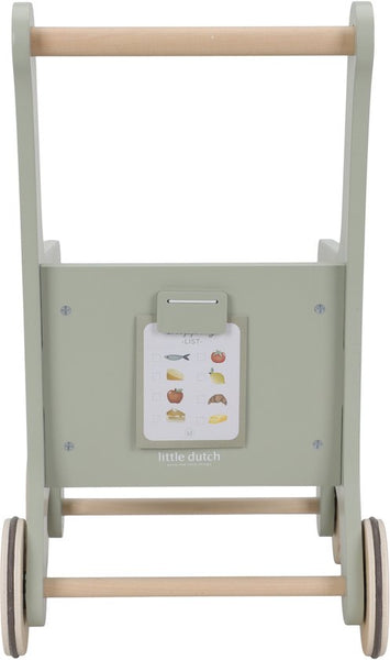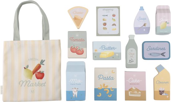 Boodschappen doen wordt een feestje! Met deze houten speelwinkelwagen haal je alles in huis wat je nodig hebt. Dankzij de ruime opbergplek passen al je boodschappen erin, zelfs als het lijstje lang is. Het houten clipje zorgt ervoor dat je boodschappenlijstje goed blijft zitten, zodat je niets vergeet. De set bevat diverse boodschappenproducten en een boodschappentas, zodat je direct aan de slag kunt. De winkelwagen is versierd met een leuke illustratie op de voorkant, wat het spelen nog leuker maakt. Wil je de ultieme winkelervaring? Combineer de winkelwagen met de marktkraam en geniet van eindeloos winkelen!