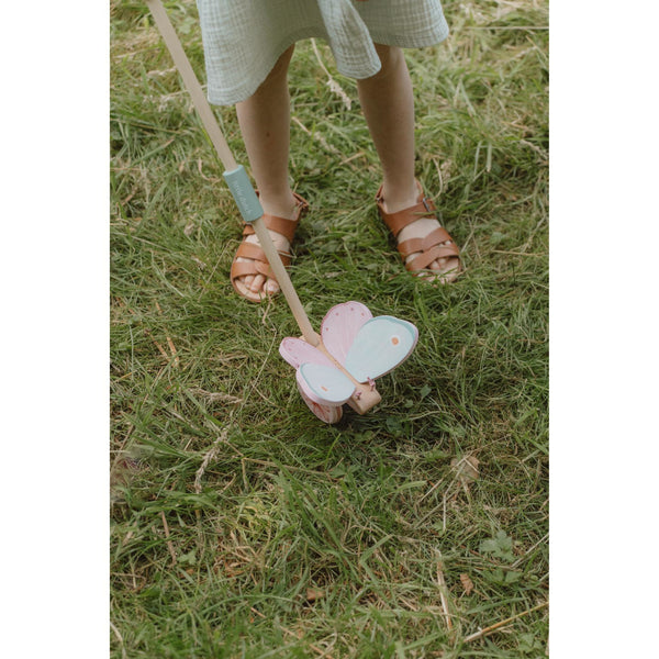 Ervaar de magie van Fairy Garden bij elke duw! Bij elke stap gaan de vleugels van de vlinder op en neer alsof hij door de kamer vliegt. Ga op avontuur door het huis en stel je voor dat je een magische tuin verkent waar de schattigste dierenvriendjes wonen en spelen samen met de mooiste feetjes. Deze duwstok zal je kleintje aanmoedigen om te gaan lopen en helpt met de ontwikkeling van de motoriek. Gemaakt van duurzaam hout met rubberen wielen, voor uren speelplezier.