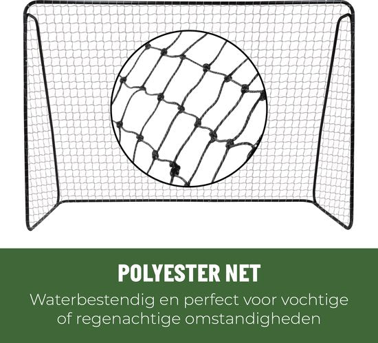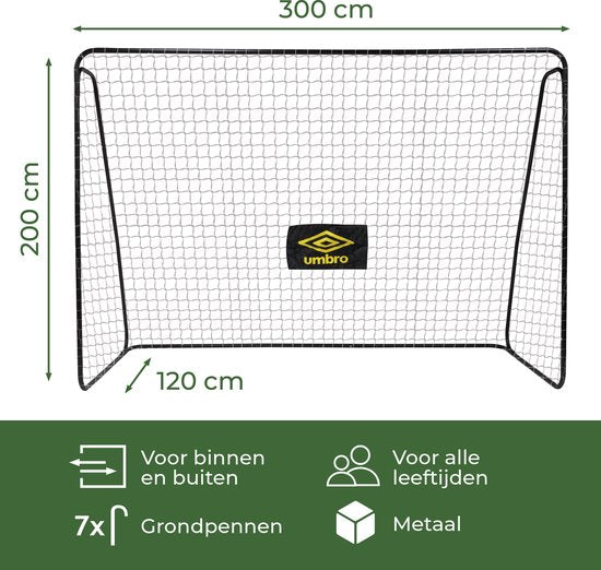 Oefen op je doeltrappen of keeper skills met dit ruime voetbaldoel van Umbro. De goal heeft een afmeting van 300 x 120 x 205 centimeter en is daardoor het perfecte voetbaltrainingsmateriaal voor alle leeftijden. Het voetbaldoel is gemaakt van duurzaam metaal, waardoor hij zeker weersbestendig is. Hierdoor hoef je de goal bij slecht weer niet elke keer op te bergen. Met de 7 meegeleverde grondhaken zet je het voetbaldoel stevig in de grond, zodat deze niet omvalt bij een harde doeltrap