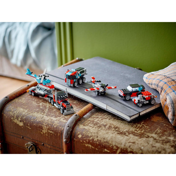 Er staan jongens en meisjes vanaf 7 jaar snelle avonturen te wachten met de LEGO Creator Truck met helikopter (31146) 3in1 set. Ze kunnen de 270 onderdelen van de LEGO Creator set gebruiken om een coole transportwagen met beweegbare wielen te bouwen die een LEGO helikopter met draaibare rotorbladen kan vervoeren op de oplegger. Kinderen kunnen met dit LEGO Creator speelgoed 3 verschillende combinaties van 2 afzonderlijke speelgoed voertuigen bouwen. Ze kunnen de speelgoed vrachtwagen met helikopter bouwen, deze ombouwen tot een propellervliegtuig en een brandstoftruck met bewegende wielen of een hot rod en terreinwagen – of de stenen gebruiken om hun eigen voertuigen te bedenken. LEGO Creator 3in1 speelgoed is een geweldig cadeau met in elke doos 3 bouwmogelijkheden voor kinderen die houden van speelgoed auto's, speelgoed vliegtuigen, LEGO voertuigen en bouwsets. Kinderen zullen de modellen graag bouwen, herbouwen en opnieuw bouwen. Ze kunnen zich urenlang vermaken met 3in1 sets die aansluiten op hun interesses, waaronder snelle voertuigen, geweldige dieren en gedetailleerde stadstaferelen. Afmetingen: deze bouwset bevat een bouwbare speelgoedvrachtwagen van ca. 9 cm hoog, 26 cm lang en 6 cm breed. Bevat 270 onderdelen.