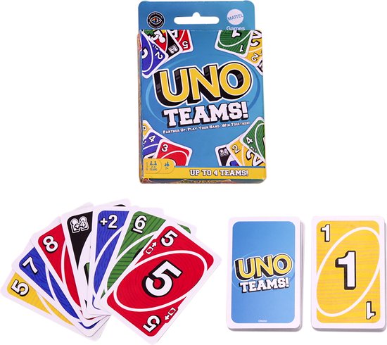UNO Teams is een nieuwe manier om het klassieke spel te spelen! Het spel draait nog steeds om bijpassende kleuren, cijfers en symbolen, maar in plaats van ieder-voor-zich, vormen twee spelers een team dat samen speelt om te winnen. Speciale kaarten en regels helpen de teamgenoten om samen te werken, maar beide spelers moeten al hun kaarten kwijtraken om te winnen. En vergeet niet 'UNO!' te roepen als jij (of je partner!) nog maar één kaart over hebt!