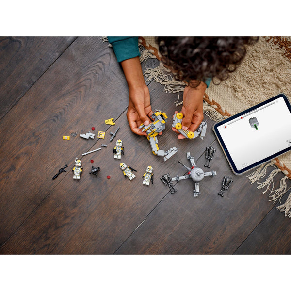 • 4 LEGO® Star Wars™ minifiguren – 4 327th Clone Troopers met een blasterpistool, 2 blasters en een blastergeweer, plus 3 LEGO figuren van Super Battle Droids