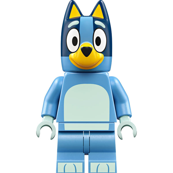 Bluey en Babbel-uil genieten van een theekransje op de veranda met een theepot, kopjes, cupcake en een stoel in de vorm van een rode paddenstoel. Na de thee geeft Bluey de planten in de tuin water.